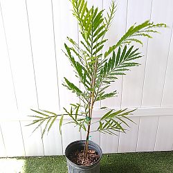 Probably the neatest feature on this tree is the winged stem holding the leaves giving it a flat appearance. It has fern-like green leaves and various orange to red flowers.